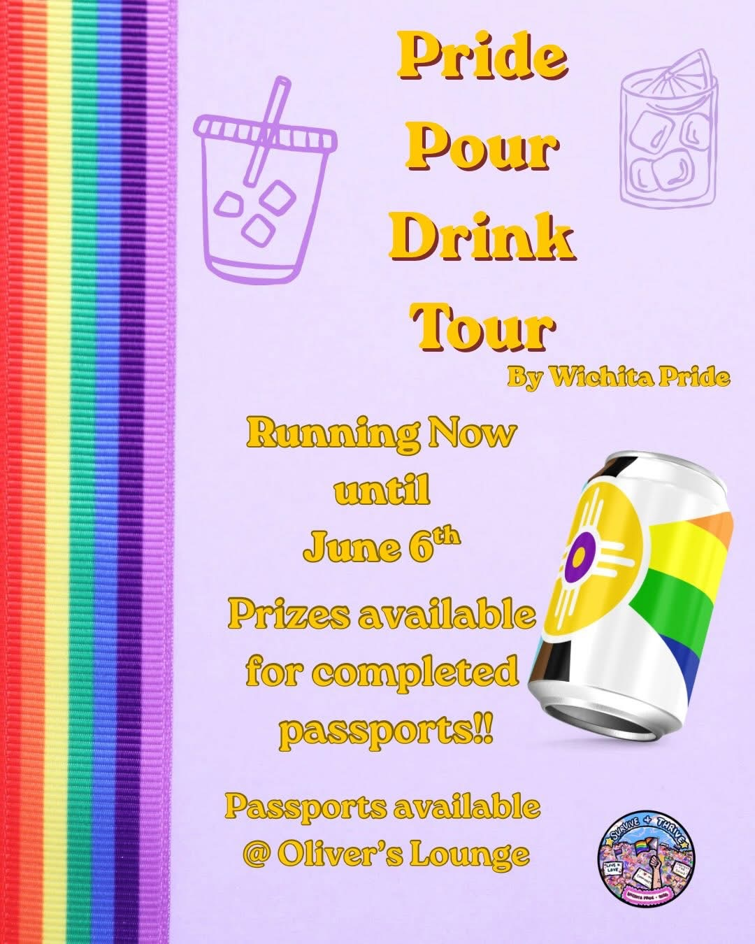 To participate all you need to do is drop by Oliver’s Lounge on the corner Oliver’s and Douglas to get your passport. Passports are $20 and proceeds go to funding our local Pride Events! Once you have your passport you can visit the local participating businesses and let them know you are doing the Wichita Pride Drink Tour! Spend at least $5 with them to get your sticker for that location!!